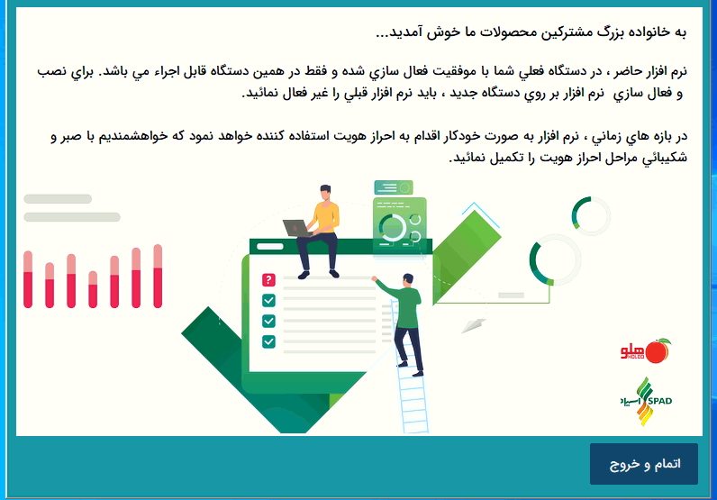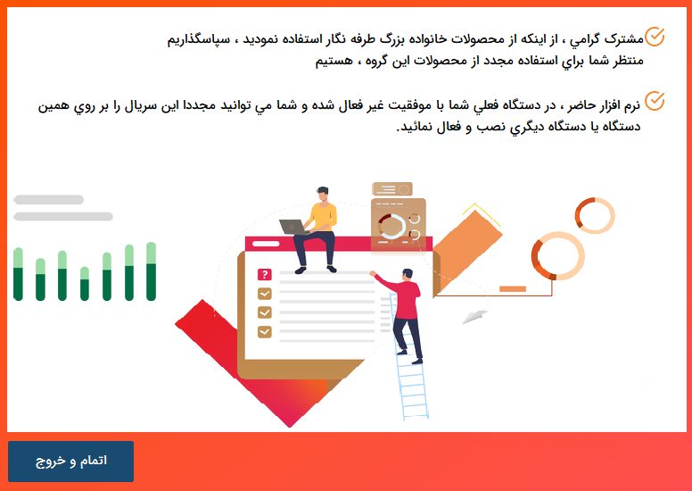 دیدن این فرم نشانه غیرفعال شدن برنامه است. با انتخاب گزینه “اتمام و خروج” برنامه بسته میشود. حالا شما میتوانید نرمافزار را روی همین سیستم یا سیستم کامپیوتری یا ویندوز جدید نصب کنید.